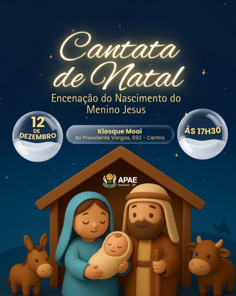 A APAE Itanhaém realiza no dia 12 de dezembro, às 17h30, a tradicional Cantata de Natal, que este ano trará uma emocionante encenação do Nascimento do Menino Jesus. O evento acontecerá no Quiosque Moai, localizado na Av. Presidente Vargas, 692 – Centro, reunindo famílias, colaboradores, estudantes e a comunidade para celebrar o espírito natalino com arte, música e inclusão.